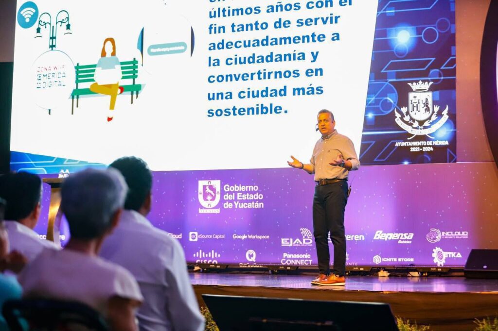 MAYO 17, 2024.- En el segundo día del Congreso Yucatán i6 2024, el Alcalde Alejandro Ruz Castro participó con la conferencia “Eco-Tech en Acción: Innovación Digital para una Mérida Sustentable”, donde recalcó los avances del gobierno municipal en materia de digitalización e innovación tecnológica ambiental que hacen más eficiente el servicio que se le brinda a la ciudadanía y mantienen a Mérida a la vanguardia digital desde hace diez años.